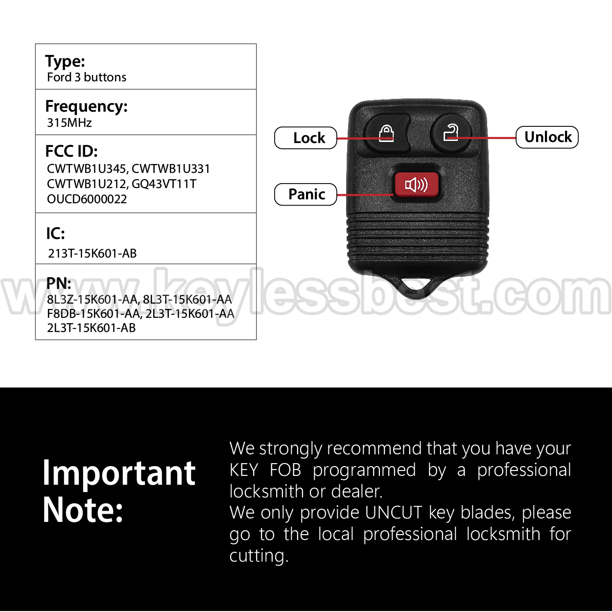 *The detailed information of this 1998-2016 Ford Lincoln Mazda Mercury keyless remote fob is as follows. Please confirm the following details match your vehicle before ordering: FCC ID , Part Number , Year Model ,IC, Frequency, Chip, and Buttons.