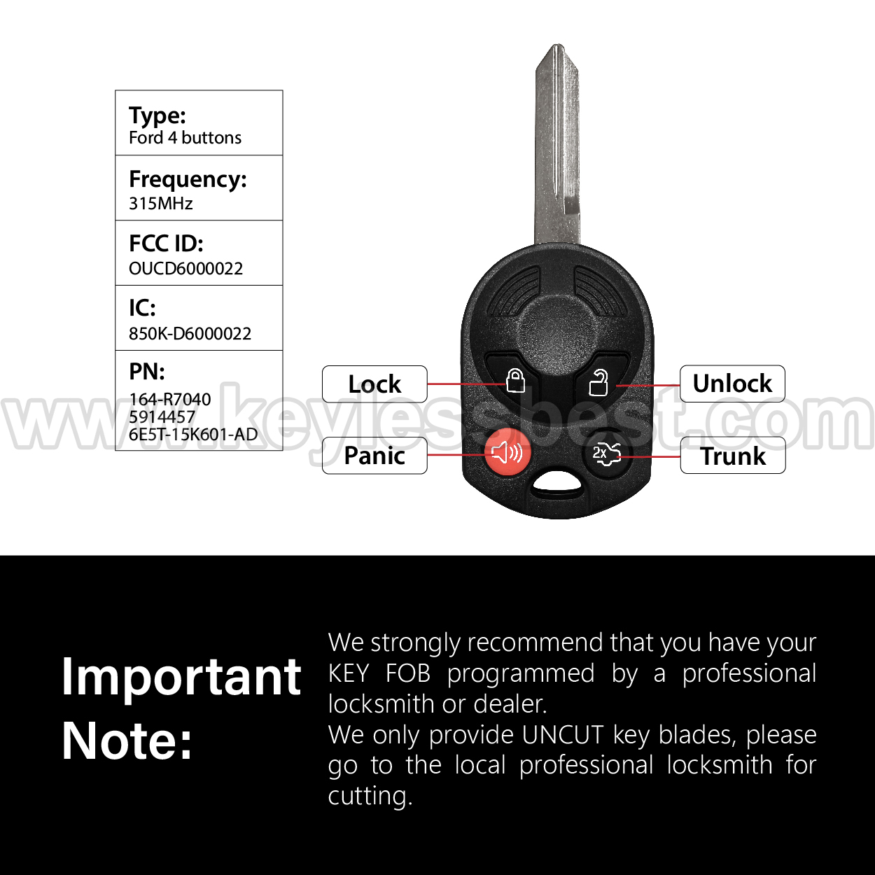 2000-2018 Ford Lincoln Mazda Mercury Edge Escape Expedition Explorer Explorer Sport Trac F-150 – F-350 Flex Focus Fusion Freestar Freestyle Ranger Taurus X Windstar / 3 Buttons Keyless Entry Remote / OUCD6000022 / PN: 850K-D6000022, 692810, 164-R7043, 5904306 / 4D63 80Bit