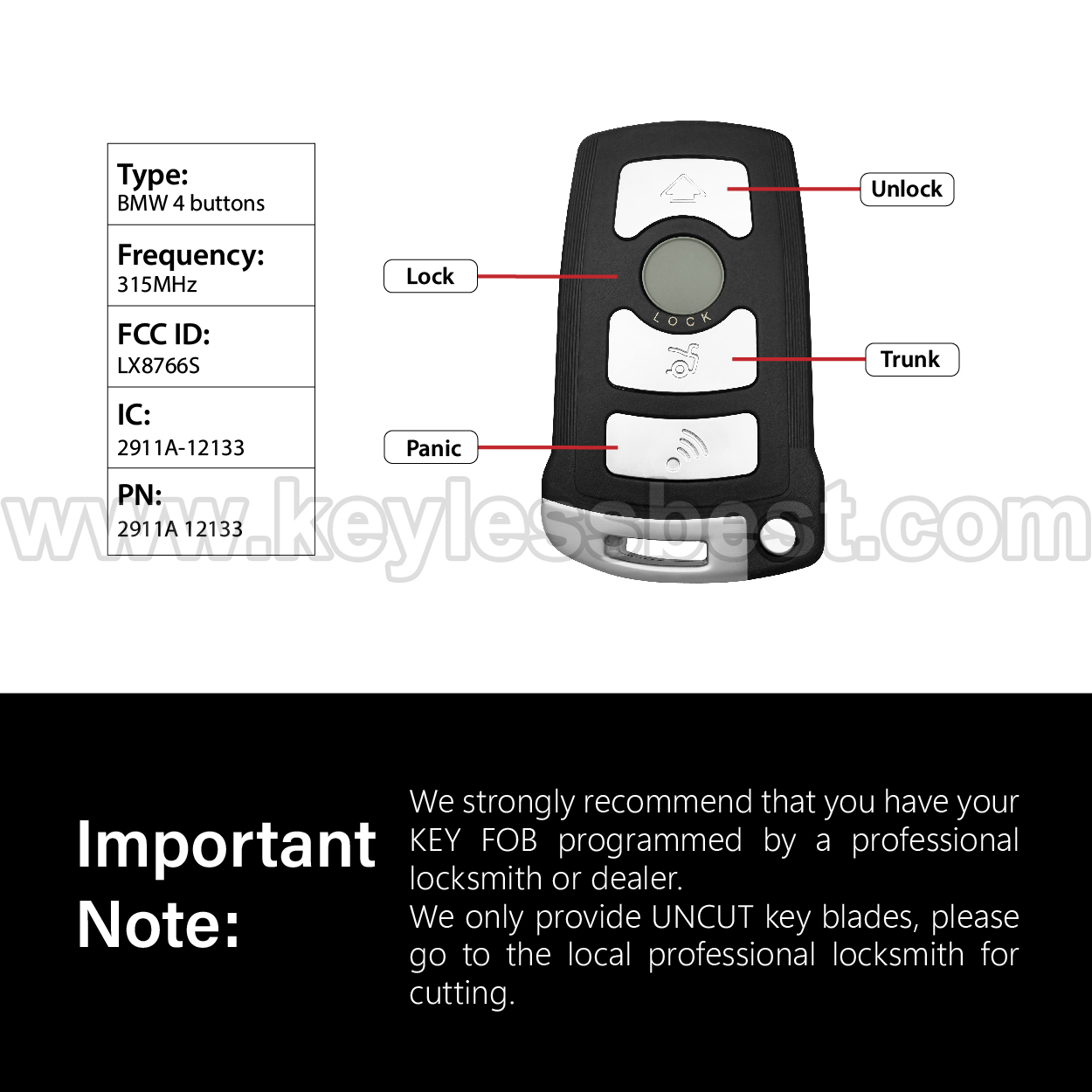 *The detailed information of this 2002 – 2008 BMW keyless remote fob is as follows. Please confirm the following details match your vehicle before ordering: FCC ID , Part Number , Year Model , IC ,Frequency, Chip, and Buttons.