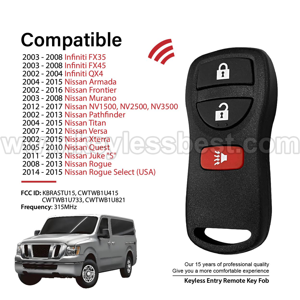 2002-2017 Infiniti Nissan FX35 FX45 QX4 Armada Frontier Murano NV1500, NV2500, NV3500 Pathfinder Titan Versa Xterra / 3 Buttons Keyless Entry Remote / KBRASTU15, CWTWB1U415, CWTWB1U733, CWTWB1U821 / PN: 28268-5W501, 28268-5W500, 28268-7Z800, 28268-C990A,28268-ZT03A