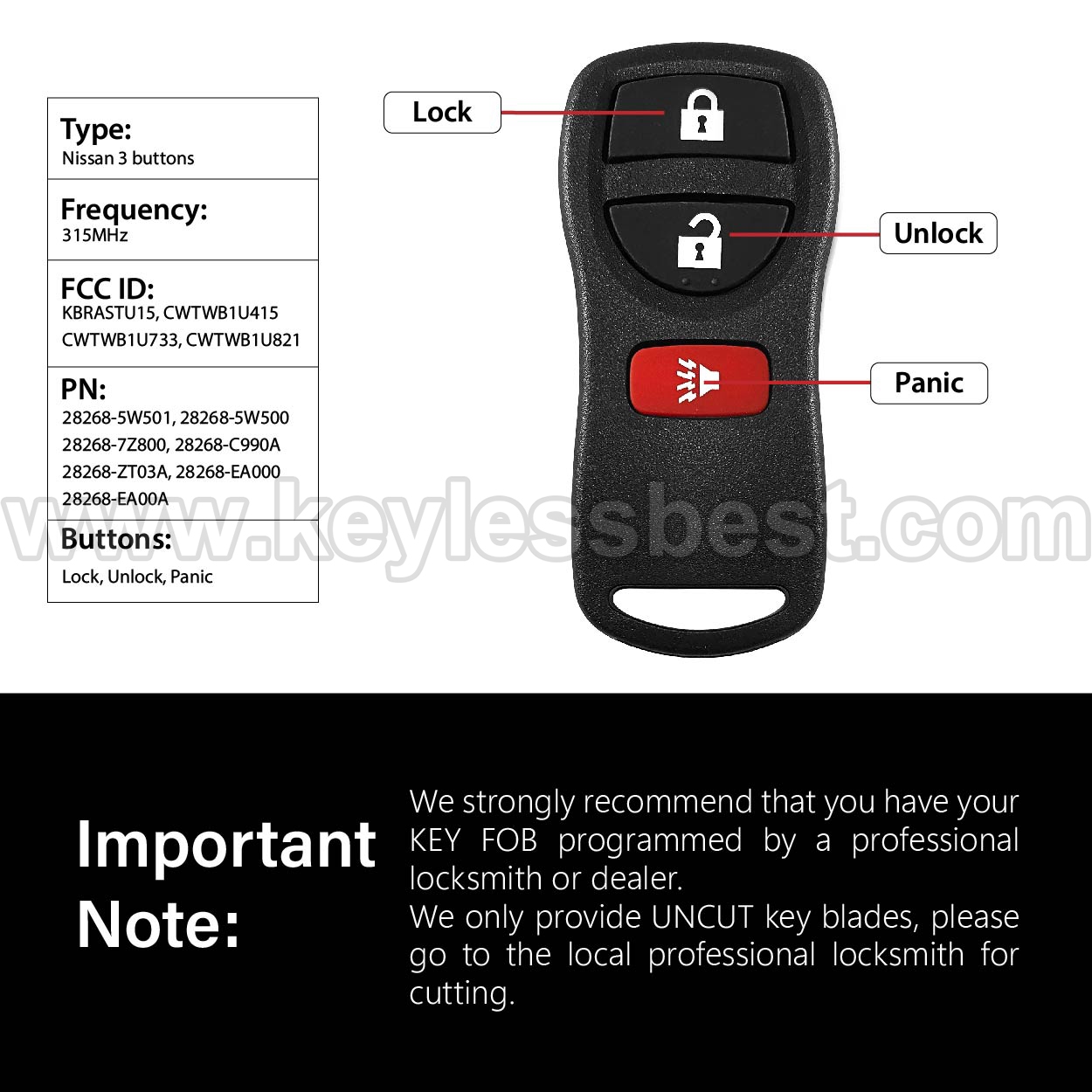- Therefore, we strongly recommend that you have your KEY FOB programmed by a professional locksmith or dealer.