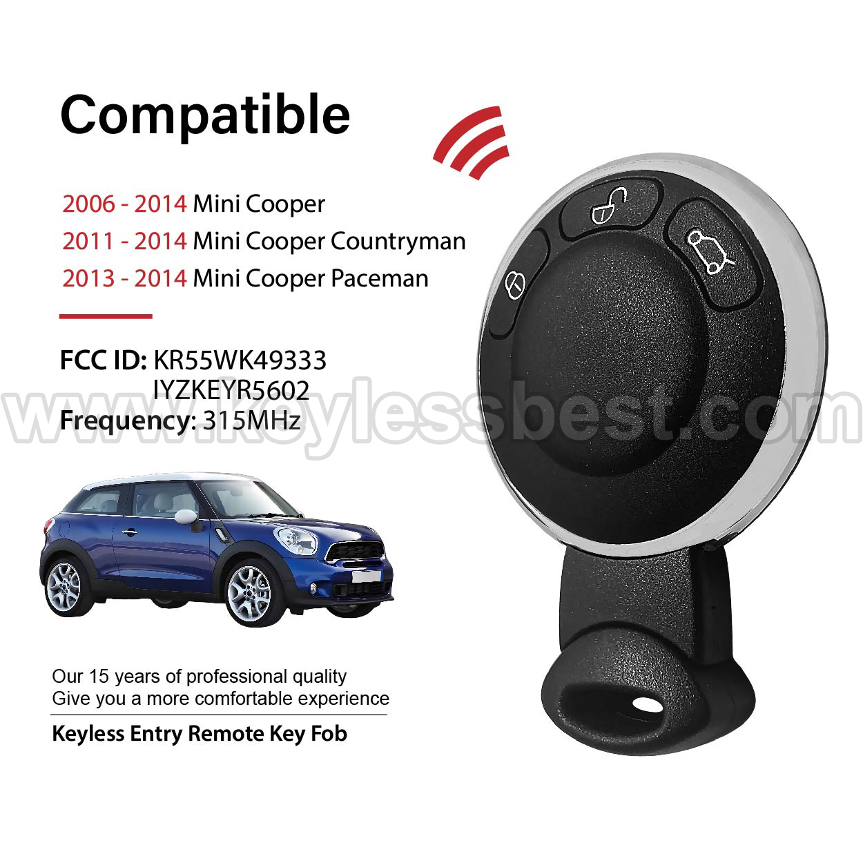 *The detailed information of this 2006 – 2014 Mini keyless remote fob is as follows. Please confirm the following details match your vehicle before ordering: FCC ID , Part Number , Year Model , IC ,Frequency, Chip, and Buttons.