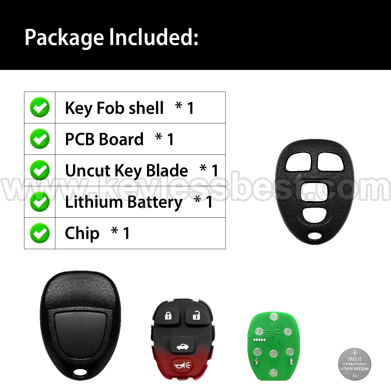 - The 2006-2016 Cadillac Chevrolet Buick smart keyless entry fob replacement – without a logo, with an uncut emergency insert key included.