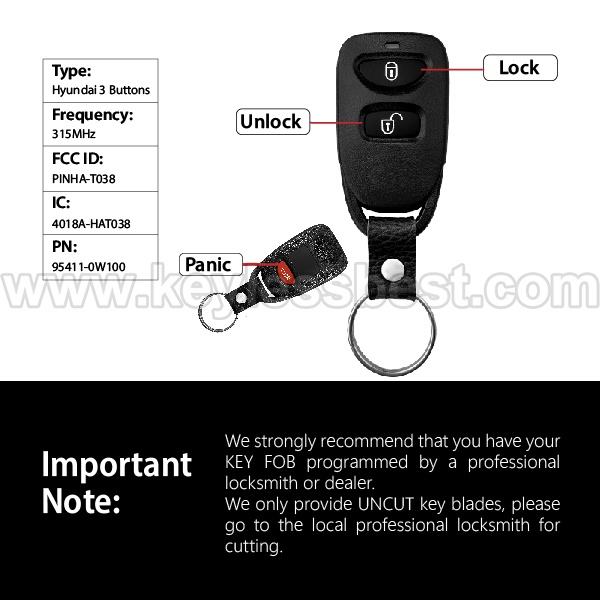 *The detailed information of this 2007-2012 Hyundai keyless remote fob is as follows. Please confirm the following details match your vehicle before ordering: FCC ID , Part Number , Year Model ,IC, Frequency, Chip, and Buttons.