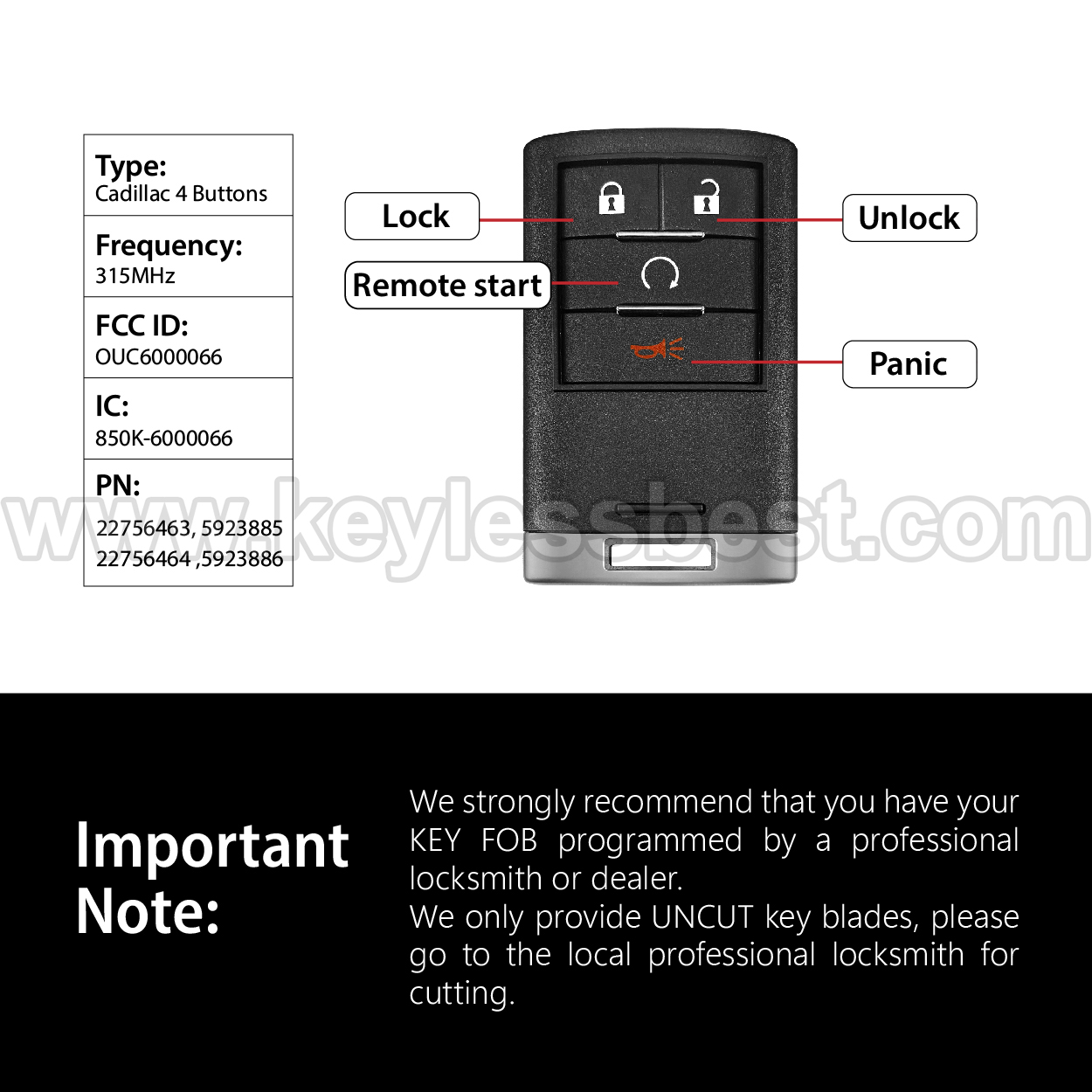 *The detailed information of this 2007-2014 Cadillac keyless remote fob is as follows. Please confirm the following details match your vehicle before ordering: FCC ID , Part Number , Year Model ,IC, Frequency, Chip, and Buttons.