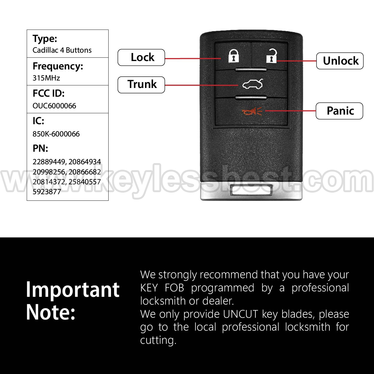 *The detailed information of this 2008-2013 Cadillac keyless remote fob is as follows. Please confirm the following details match your vehicle before ordering: FCC ID , Part Number , Year Model ,IC, Frequency, Chip, and Buttons.