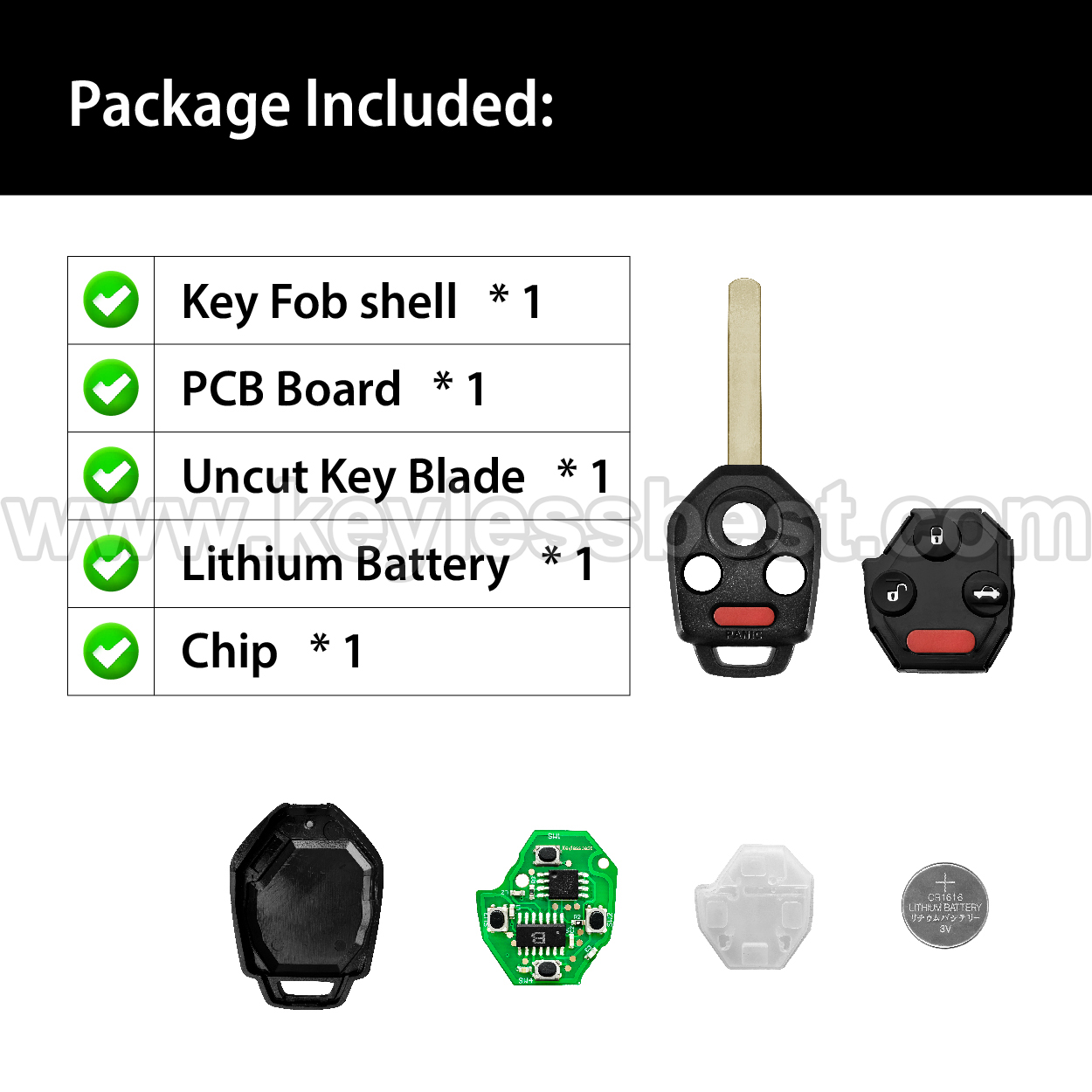 - The 2010-2014 Subaru smart keyless entry fob replacement – without a logo, with an uncut emergency insert key included.