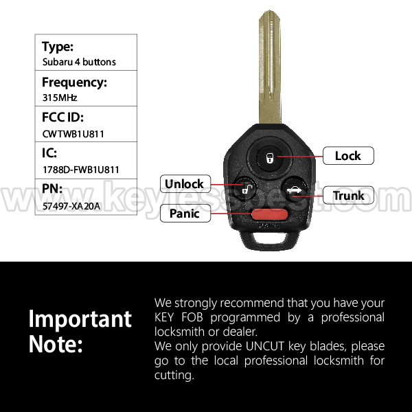 *The detailed information of this 2011-2014 Subaru keyless remote fob is as follows. Please confirm the following details match your vehicle before ordering: FCC ID , Part Number , Year Model ,IC, Frequency, Chip, and Buttons.