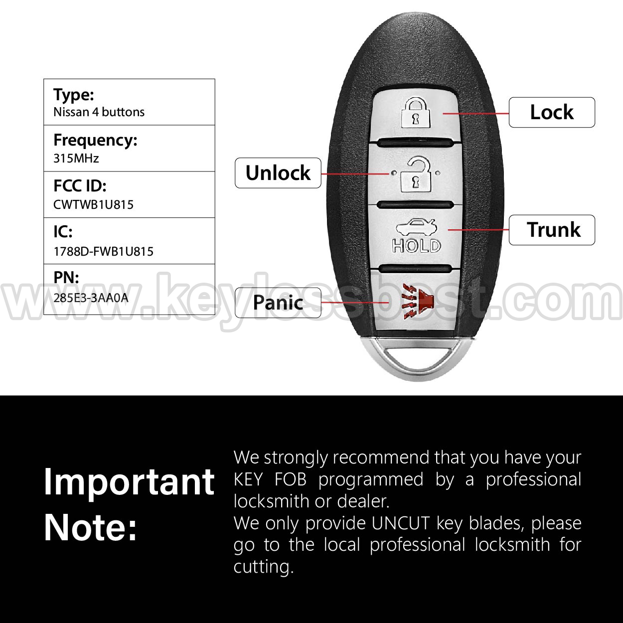 NISSAN VERSAImportant: There are 2 possible remotes for the 2013 Sentra (CWTWB1U840 and CWTWB1U815) – please match FCC ID with the original key. Most vehicles built before 5/13 will use CWTWB1U815. Most vehicles built after 5/13 will use CWTWB1U840. Please verify prior to purchasing.