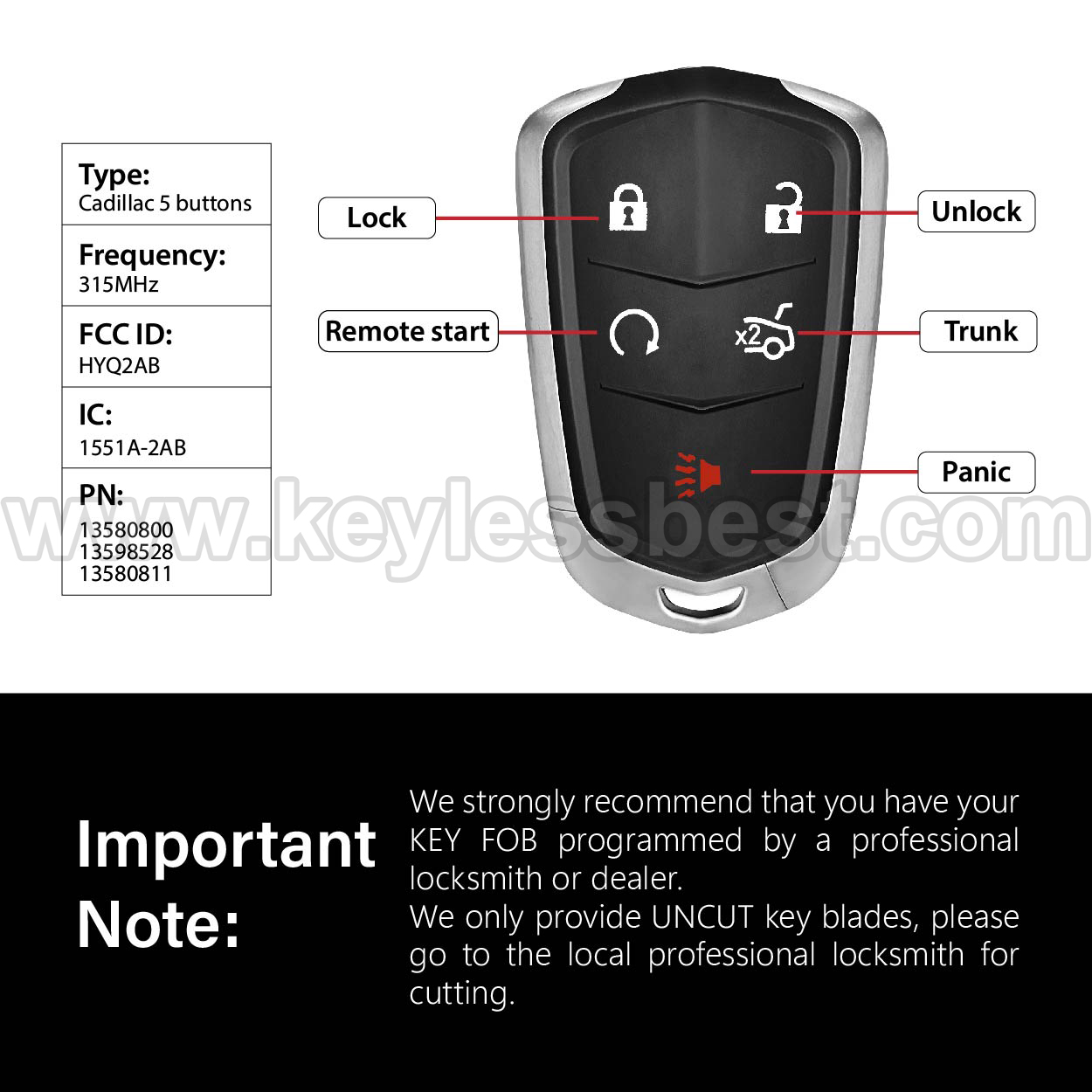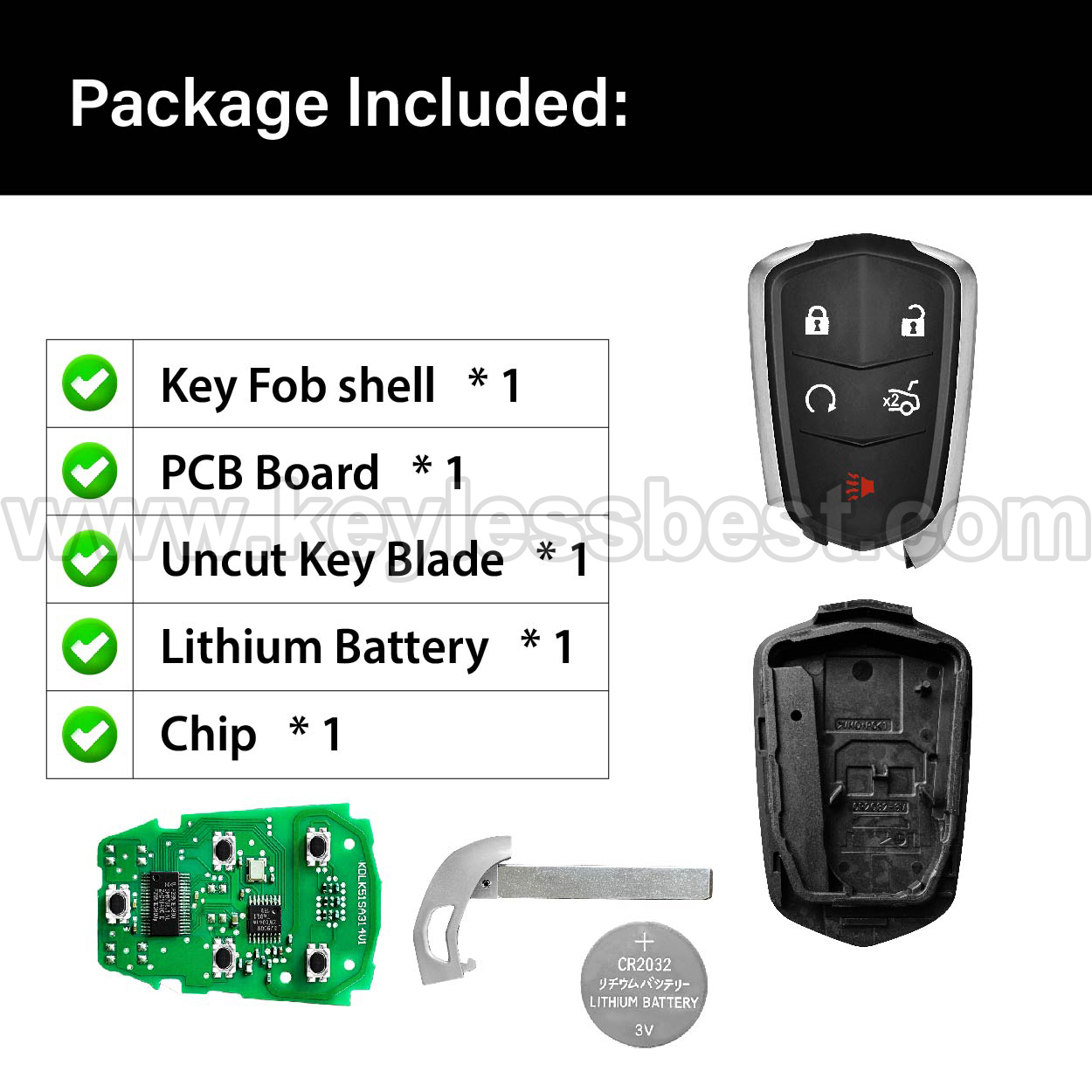 *The detailed information of this 2014 – 2019 Cadillac keyless remote fob is as follows. Please confirm the following details match your vehicle before ordering: FCC ID , Part Number , Year Model , IC , Frequency, Chip, and Buttons.