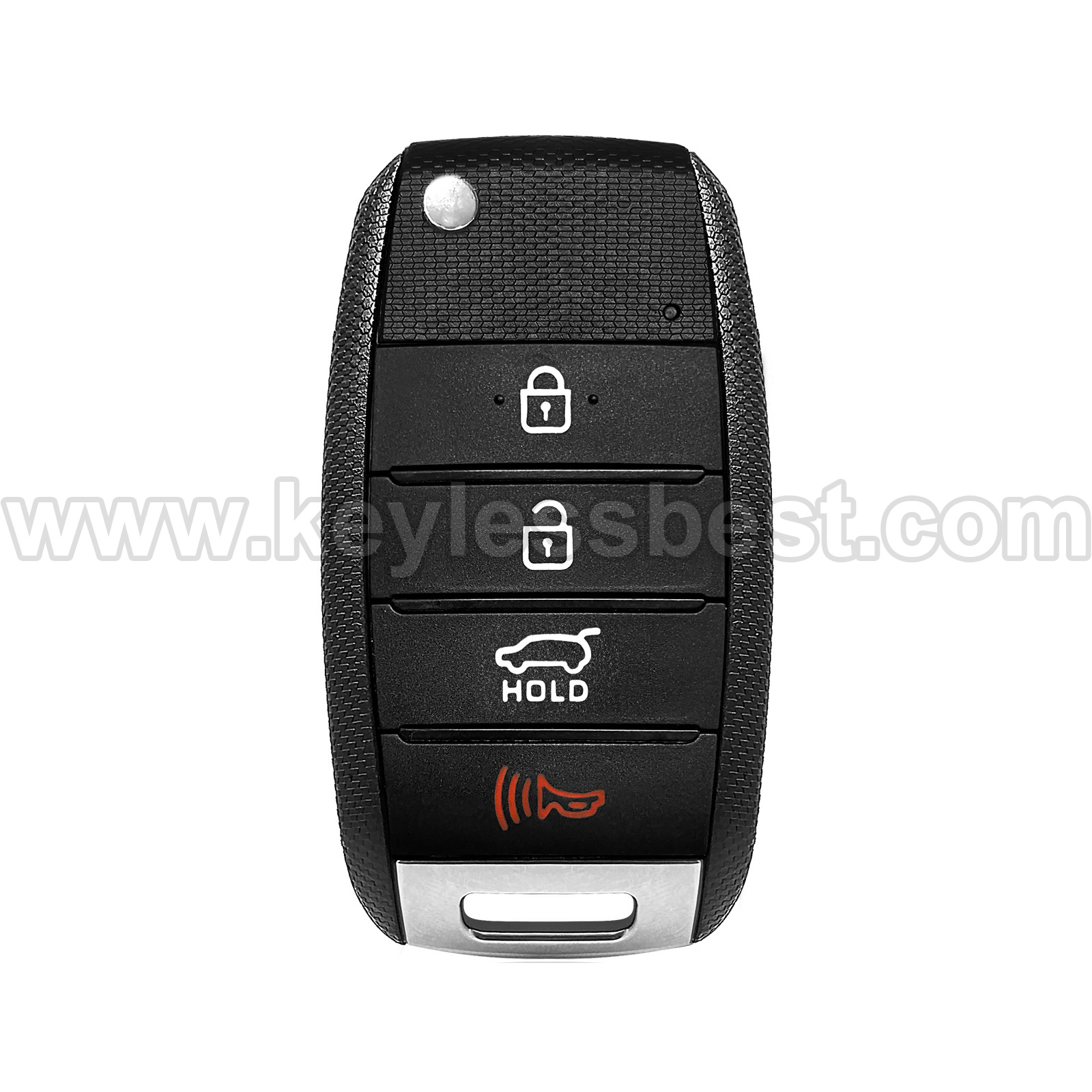 - The 2014-2019 Kia smart keyless entry fob replacement – without a logo, with an uncut emergency insert key included.