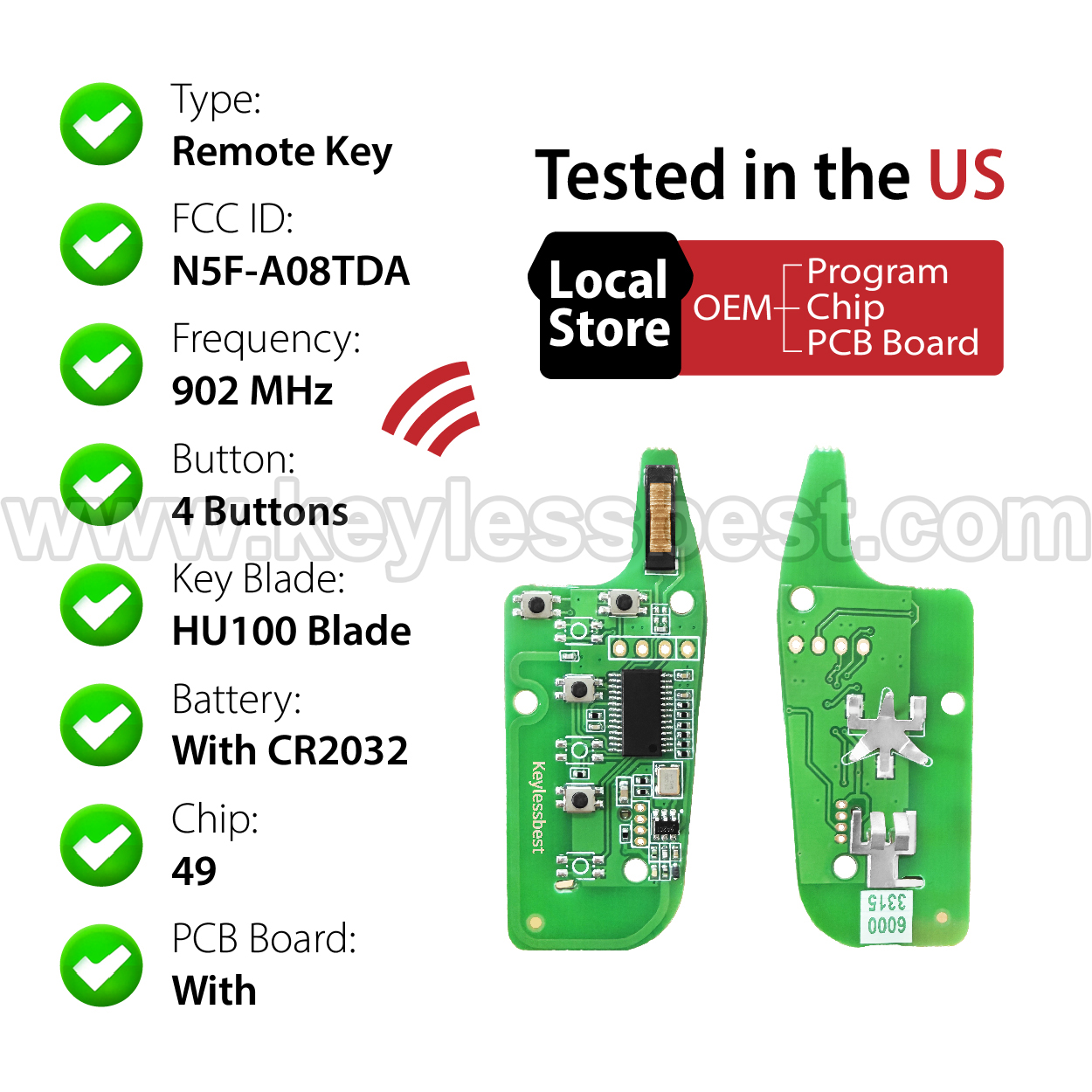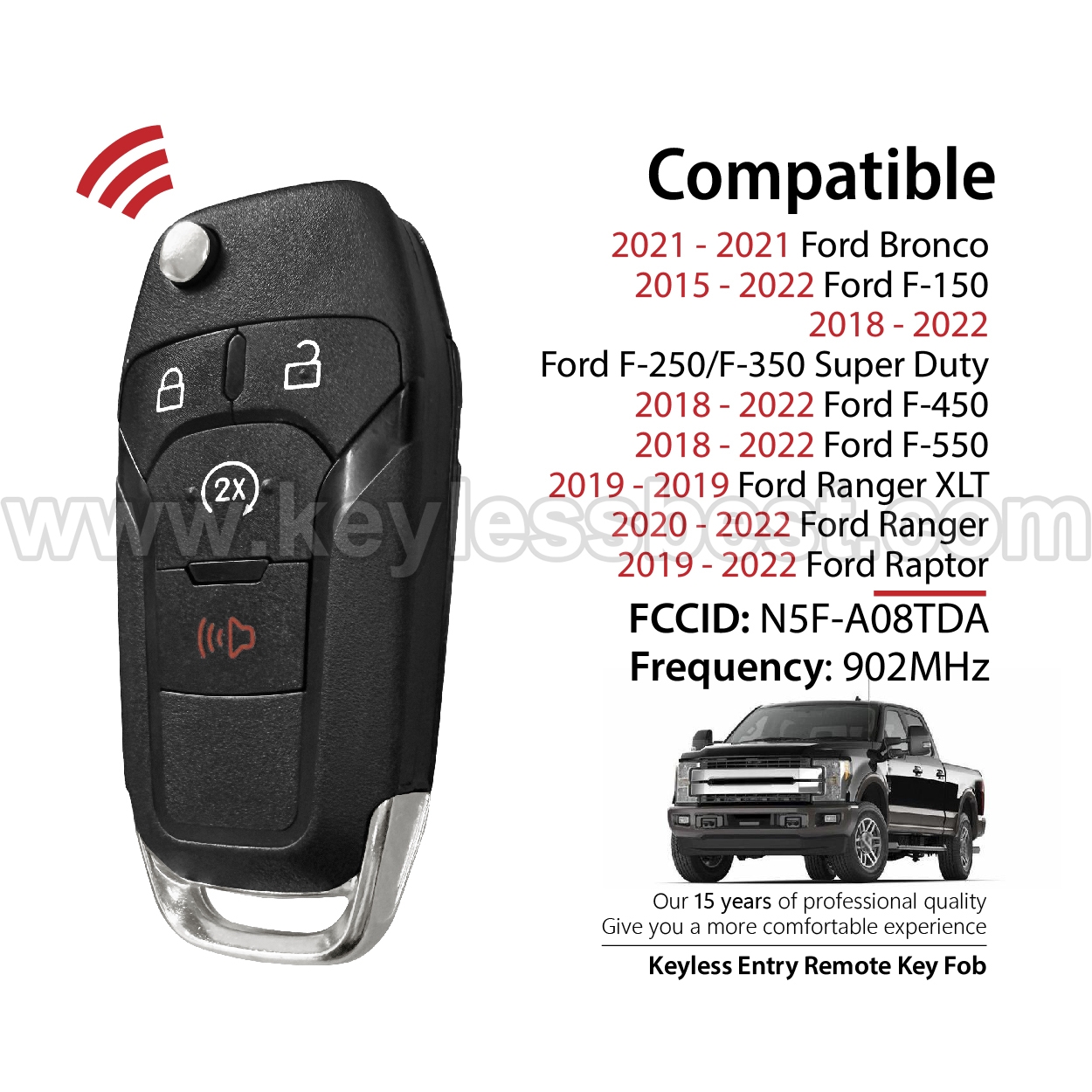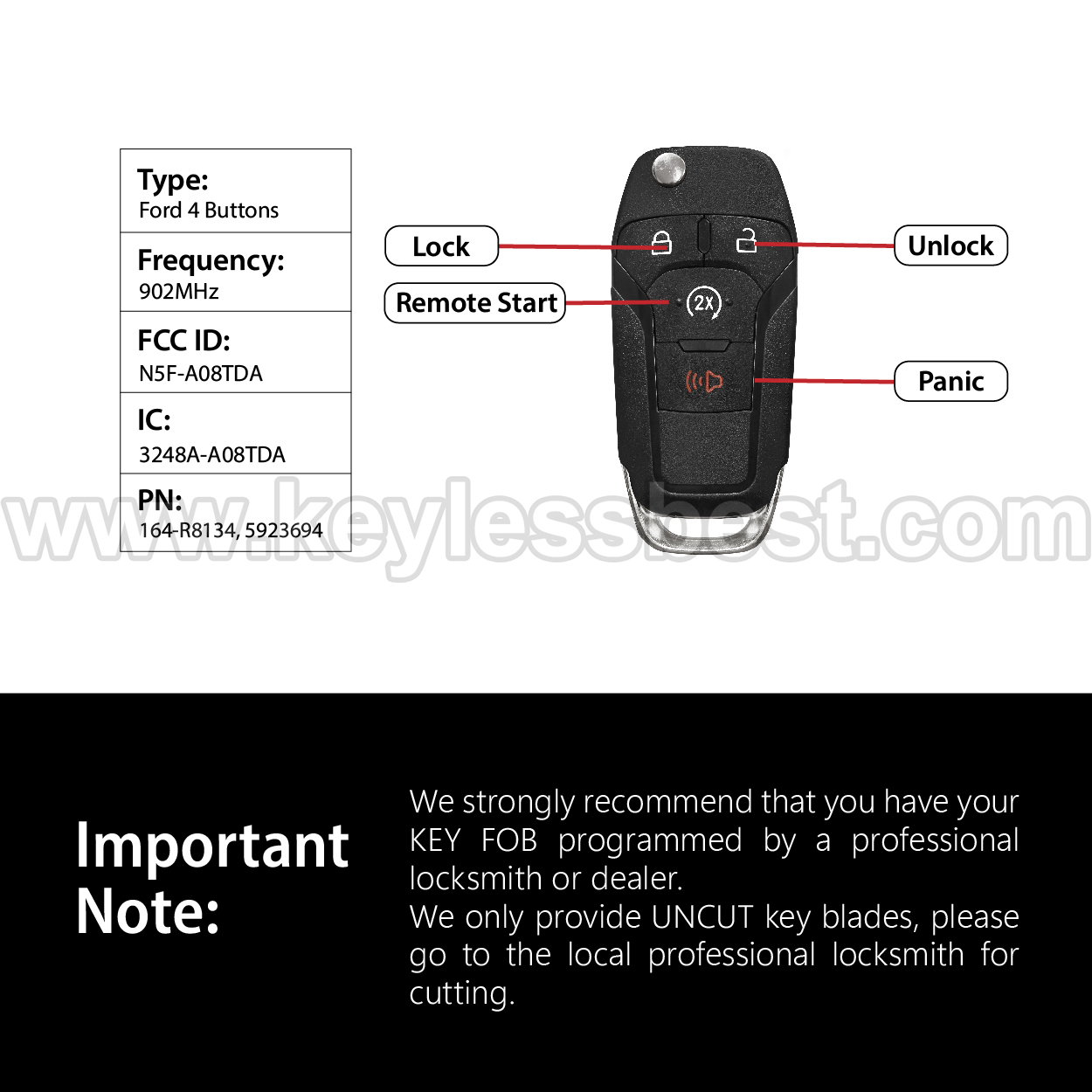 *The detailed information of this 2015-2022 Ford keyless remote fob is as follows. Please confirm the following details match your vehicle before ordering: FCC ID , Part Number , Year Model ,IC, Frequency, Chip, and Buttons.