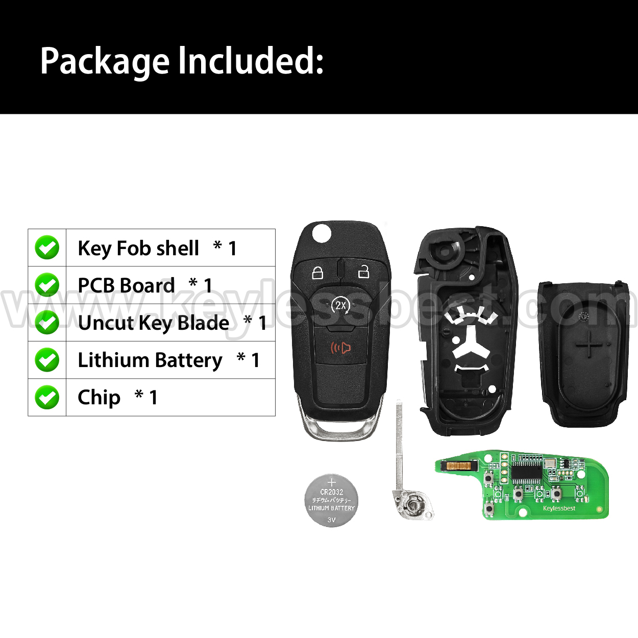 • The 2015-2022 Ford smart keyless entry fob replacement – without a logo, with an uncut emergency insert key included.