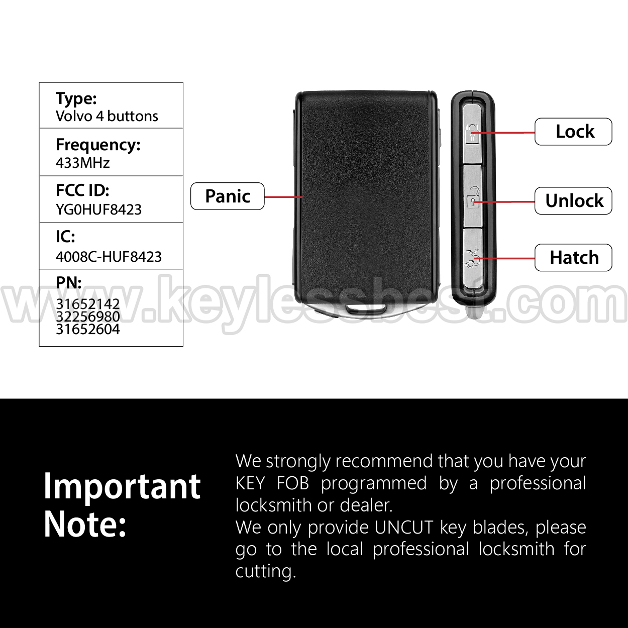 *The detailed information of this 2016-2019 Volvo keyless remote fob is as follows. Please confirm the following details match your vehicle before ordering: FCC ID , Part Number , Year Model , IC , Frequency, Chip, and Buttons.