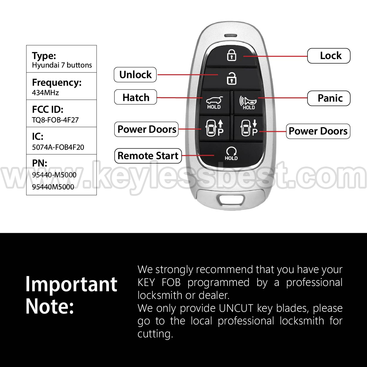 *The detailed information of this 2019-2022 Hyundai keyless remote fob is as follows. Please confirm the following details match your vehicle before ordering: FCC ID , Part Number , Year Model , IC , Frequency, Chip, and Buttons.