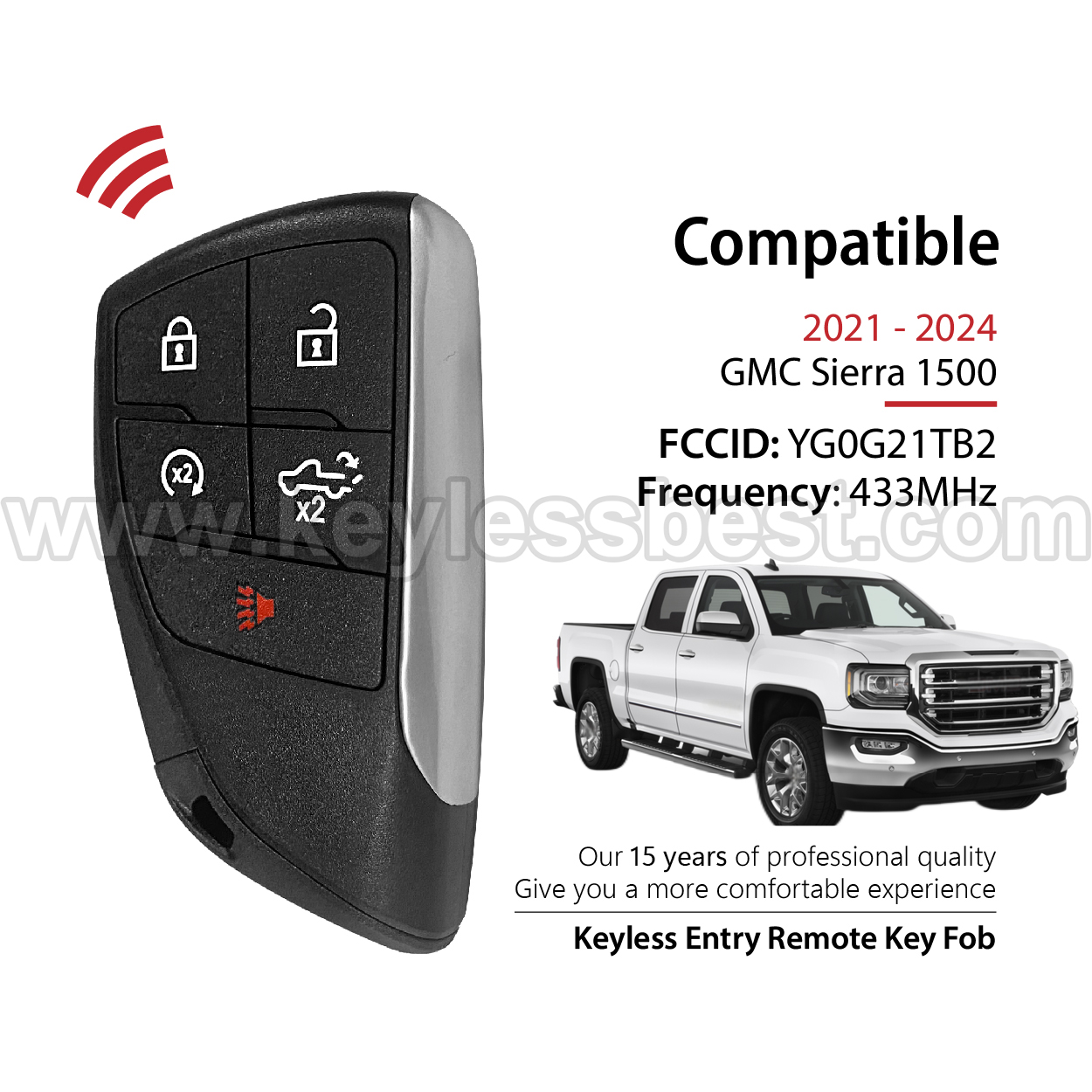 - The 2021-2024 GMC smart keyless entry fob replacement – without a logo, with an uncut emergency insert key included.