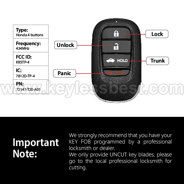 *The detailed information of this 2022-2024 Honda keyless remote fob is as follows. Please confirm the following details match your vehicle before ordering: FCC ID , Part Number , Year Model ,IC, Frequency, Chip, and Buttons.