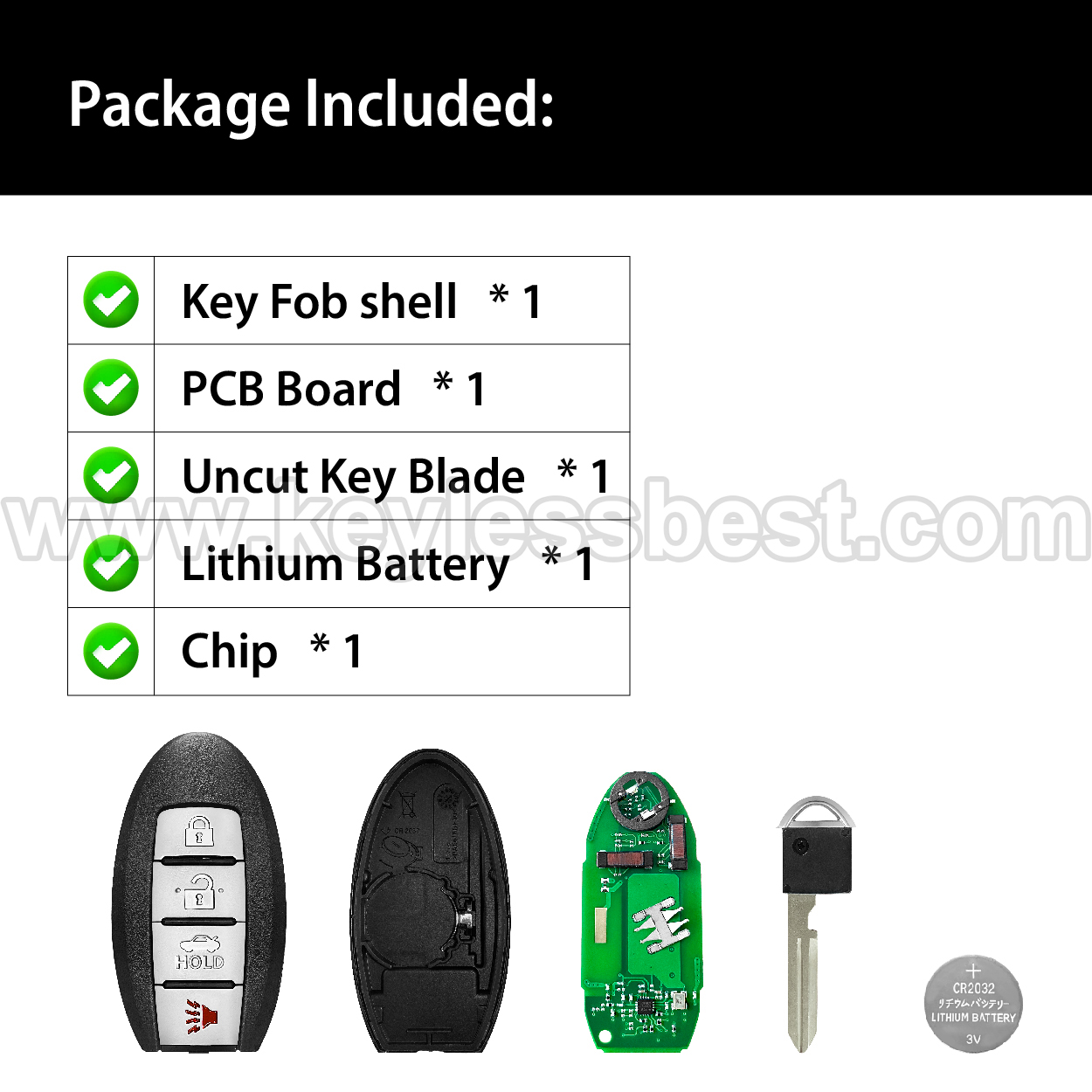 *Подробная информация о бесключевом пульте дистанционного управления Nissan Infiniti 2002-2017 годов выпуска приведена ниже. Пожалуйста, подтвердите, что следующие данные соответствуют вашему автомобилю, прежде чем заказывать: FCC ID, номер детали, год модели, IC, частота, чип и кнопки.
